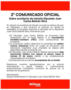 Lo anterior, se dio a conocer a través de su cuenta de Instagram y X, con una publicación acompañada del mensaje: “El Diputado Juan Carlos Beltrán fue trasladado a un Centro Asistencial para recibir atención oportuna y realizar los exámenes médicos de rigor producto del siniestro”.